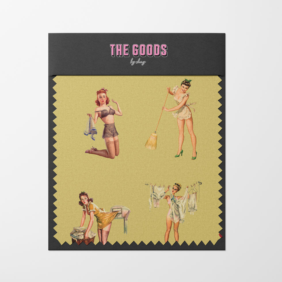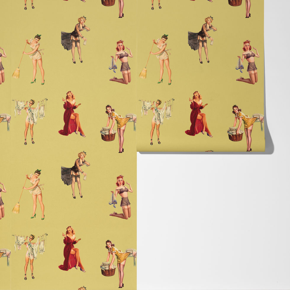 The "40's Housewives" pinup print radiates playful charm in this vibrant buttercup yellow colorway. The retro pinup illustrations of glamorous housewives come to life against the soft yellow backdrop, adding a cheerful and lively touch to any space. This design is ideal for those looking to brighten up their decor with a burst of color and a hint of vintage flair, making it perfect for accent walls, kitchens, or creative projects