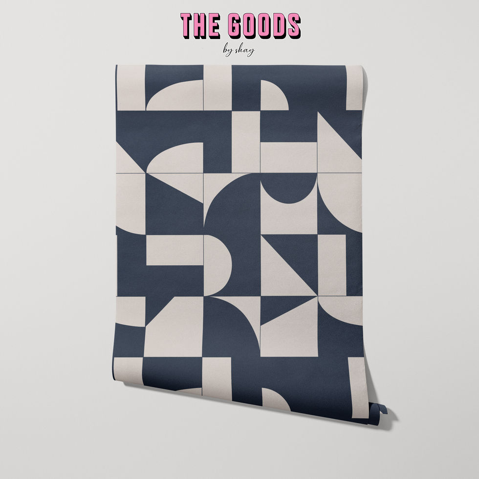 This variation of the "Cubist Chic" print takes on a sophisticated twist with deep navy blue and cream tones. The geometric shapes maintain their bold and rhythmic pattern, but the color shift adds a touch of elegance and depth, perfect for a modern yet timeless look.
